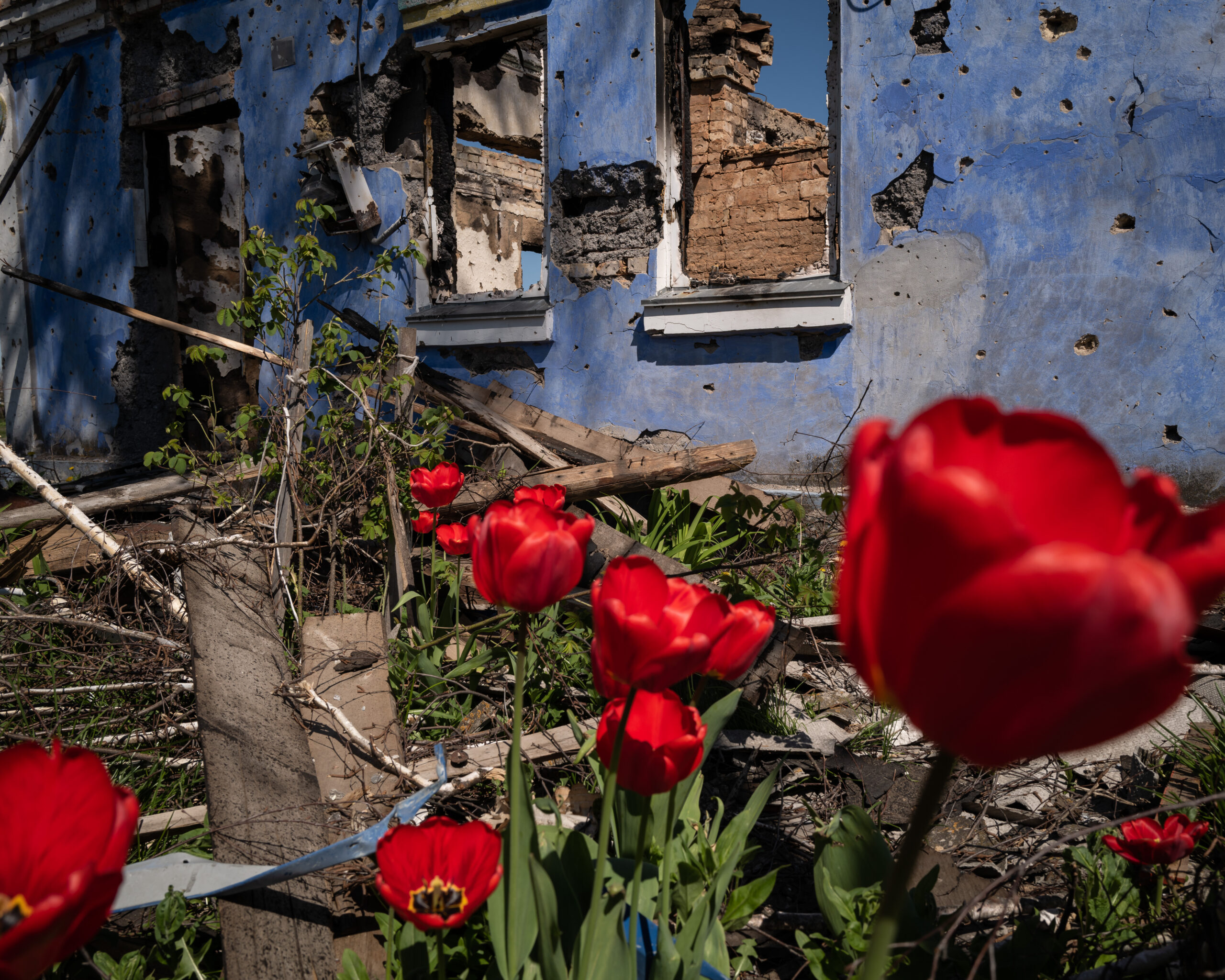 Le village, Ukraine, dans la région du Nord-Est de Kiev. Des maisons portent les stigmates des combats. C’est le printemps, les tulipes ont poussé.